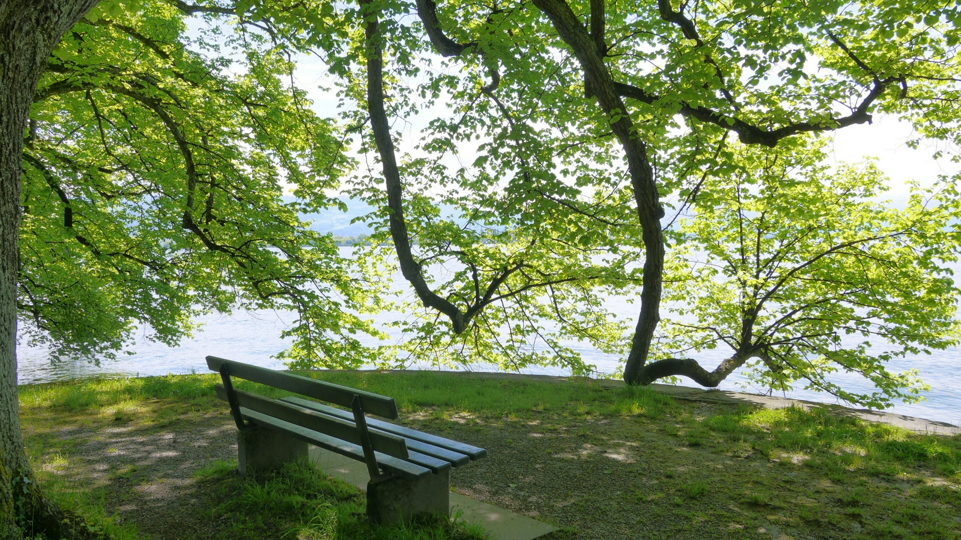 Bench with trees by a lake